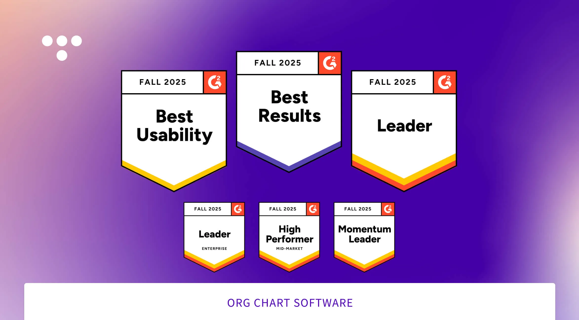 In the Org Chart category, we still rank #1 in Usability and Best Results, winning a total of 5 badges on the following 13 reports: