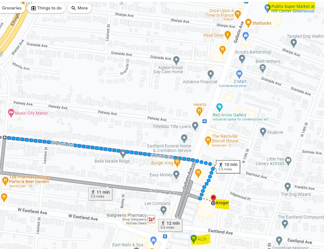 Obviously, you can’t bring everything with you in your car and you’ll need to buy some food. If you live closer, say walking distance, to a grocery store you are more likely to go there. When I stayed in East Nashville I made sure I was close to one. I lucked out and was close to an Aldi, Kroger, and Publix all within a mile.